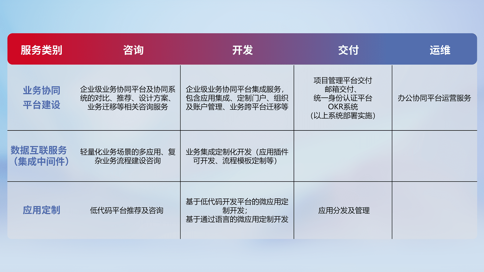 针对钉钉、、、企微、、IDaas等平台级产品提供产品的规划、、方案、、、交付、、、定制化开发等服务,,,,实现如统一协同办公、、智能客户服务、、、、混合会议管理、、、智能数据查询、、等业务场景,,,实现数字化转型。。。