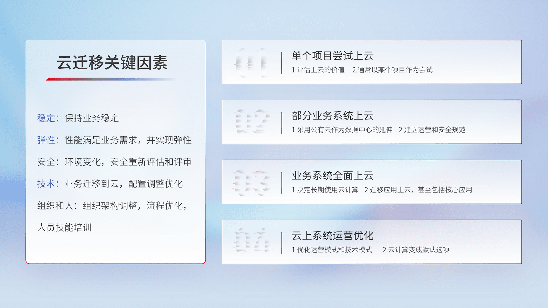 结合实际业务,,从规划设计、、云平台选型、、云原生改造、、、、数据迁移、、、、集成交付,,,,迁移全过程为客户识别最佳上云路径,,,做好风险识别管理,,,设计网络架构、、、、身份权限、、、、安全审计合规、、、、操作审计、、、、日志审计、、、监控告警策略、、、多站点容灾设计等,,,,对云上基础设施进行整体规划,,,提升IT治理水平,,,,以满足弹性、、、、高可用、、、高性能的需求。。。。