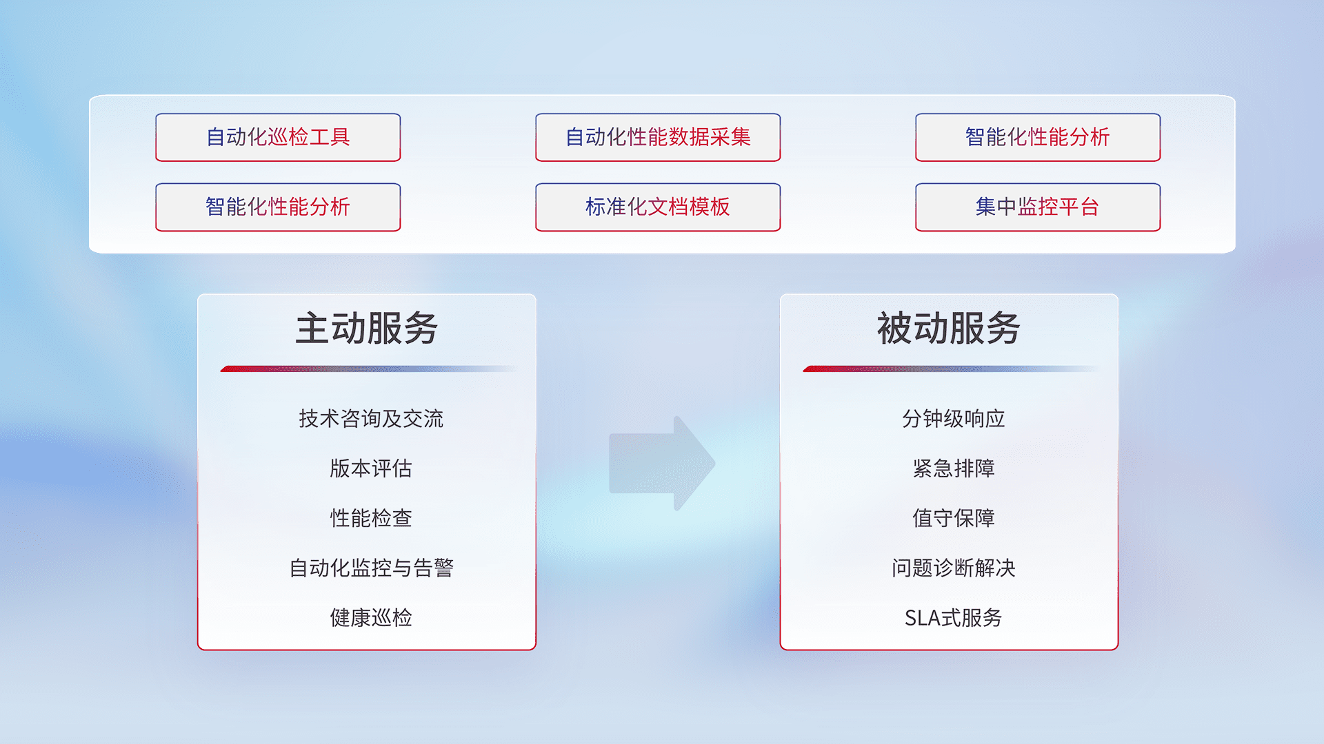 智能化工具和标准化文档,,,保障服务质量,,,,提供主动服务(包含技术咨询、、、版本评估、、、、性能检查、、、自动化监控与告警、、、健康巡检)和被动服务包含(分钟级响应、、、、紧急排障、、、值守保障、、问题诊断解决、、、、SLA服务)。。