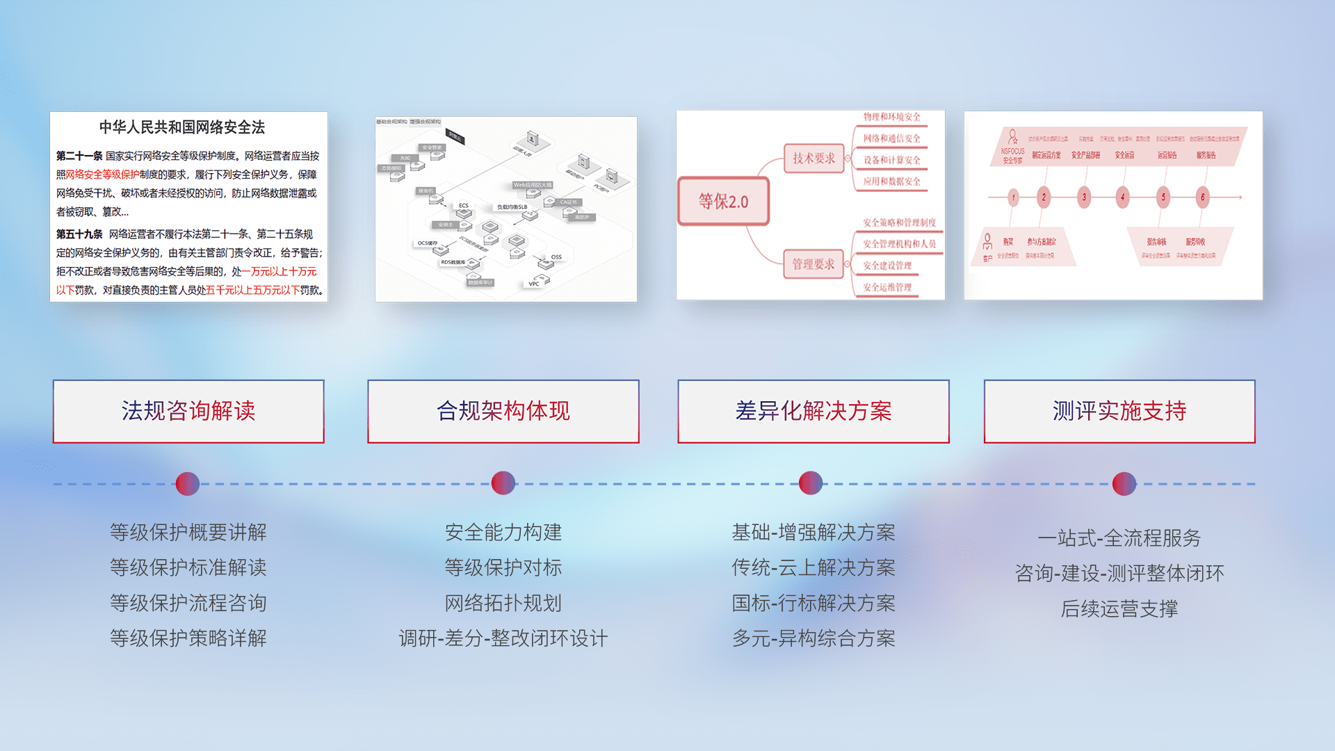 通过专业的法律咨询解读、、合规架构体现、、差异化解决方案、、、测试实施支持等服务,,,,为客户量身打造等保合规体系。。。。